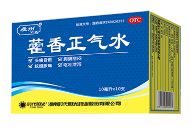 藿香正气水 商标名称:时代阳光 产品性能:解表化湿,理气和中。用于外感风寒、内伤湿滞或夏伤暑湿所致的感冒,症见头痛昏重、胸膈痞闷、脘腹胀痛、呕吐泄泻;胃肠型感冒见上述证候者用法用量:口服。一次半支(5毫升)~1支(10毫升),一日2次,用时摇匀成 份:苍术、陈皮、厚朴(姜制)、白芷、茯苓、大腹皮、生半夏、甘草浸膏、广